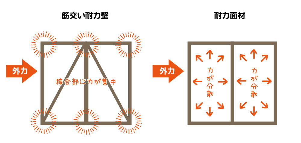 ■耐力壁の種類は大きく分けて2種類。筋かいと耐力面材