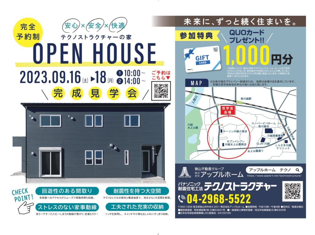 Warning: Undefined array key "type" in /home/c0521727/public_html/apple-h.net/technostructure/wp-content/themes/1212/functions.php on line 1260 完成見学会と構造見学会を同時開催!! 9月16日~3日間限定(^^♪ | 狭山市・入間市・所沢市の地震に強い注文住宅テクノストラクチャーの家|株式会社アップルホーム