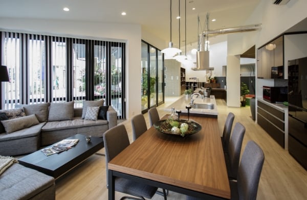 上吊り戸にすると溝の無いフラットな床になって、リビングとダイニングの一体感が生まれます。溝の埃などの面倒な掃除の必要がありません。