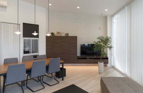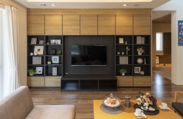 見せる収納と隠す収納をバランス良く取り入れています。広いリビングが出来るので大きなTVも置き場所に悩む必要がありません。