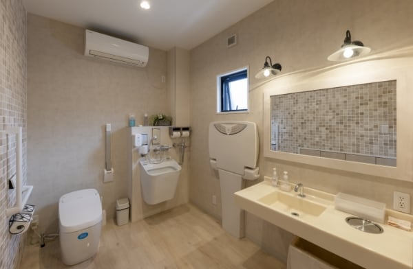 赤ちゃん連れや、車椅子などでも安心してご来店いただける多機能洗面室です。どなたでも快適にご利用いただける広さです。