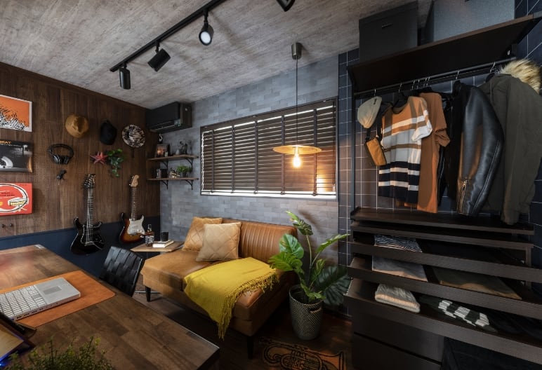 アイアン調の小物や黒をベースに、革や年代物の家具・雑貨を合わせた重厚感のあるスタイル。